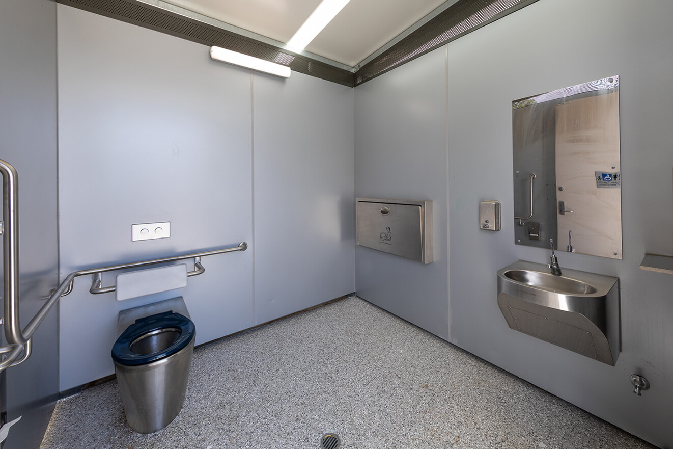 Stage 1 of the project included upgrading the off-street parking, building a new district level play space including a picnic area and public toilets. The STELLAR S2015 model was preferred by Council which includes a Unisex AUWC Cubicle with Baby Change Table and a single Unisex Ambulant Toilet. The building includes an service area and covered verandah.